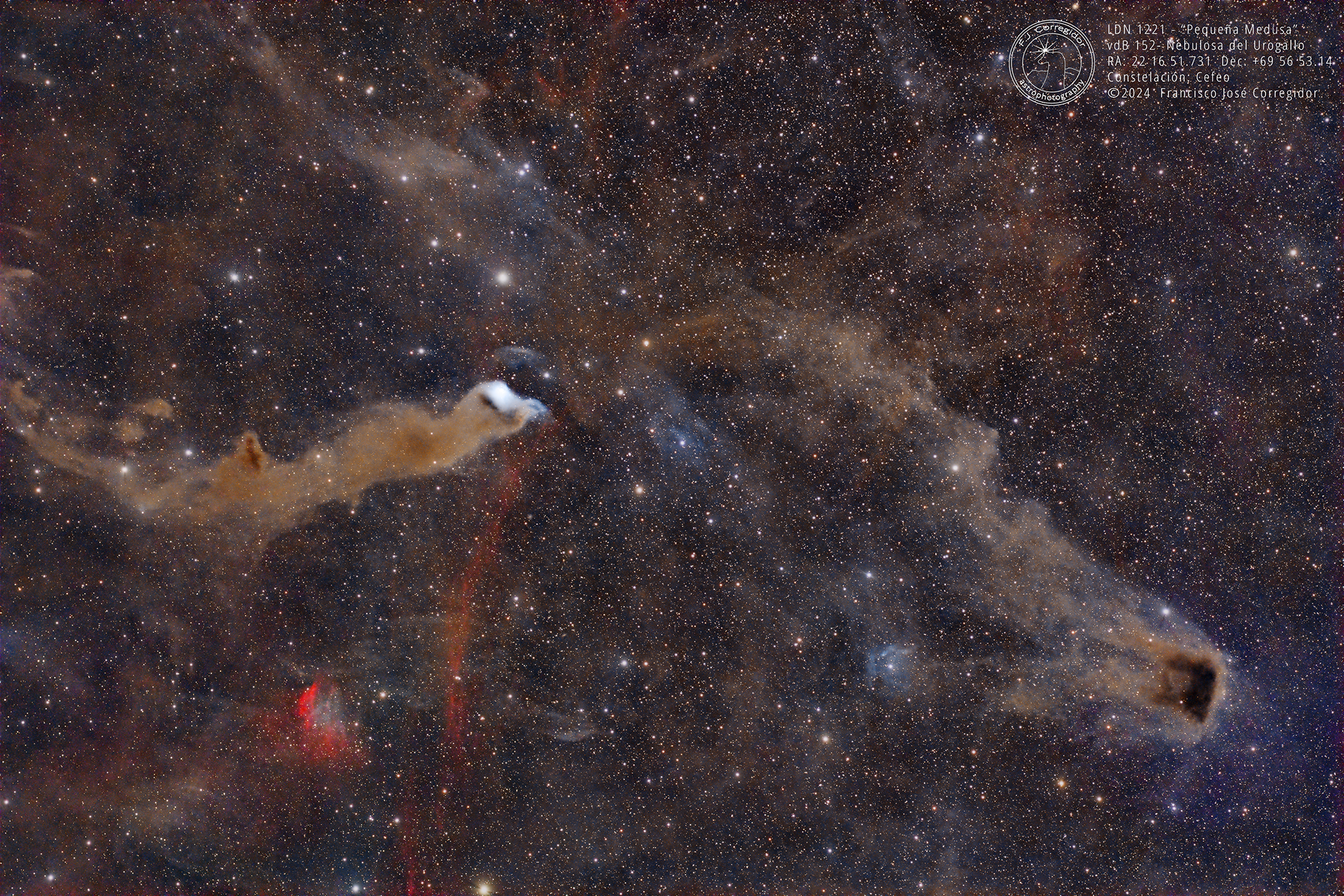 La primera muestra a nuestro amigo mirando a lo que ha llamado por ahí una pequeña medusa; la segunda la muestra separándose del conocido tiburón. Todo polvo interestelar en el que se forman estrellas, como en la cabeza del urogallo.