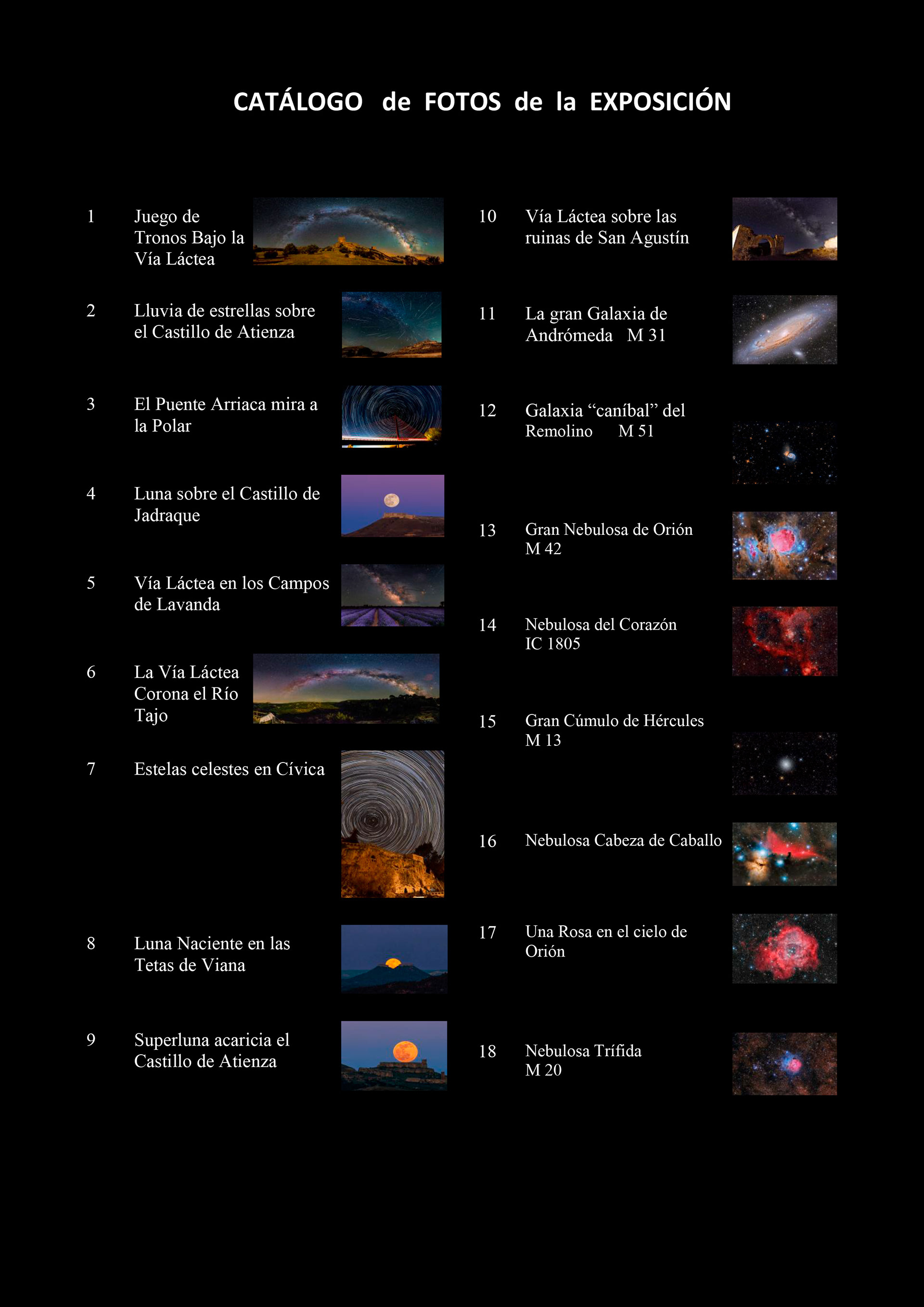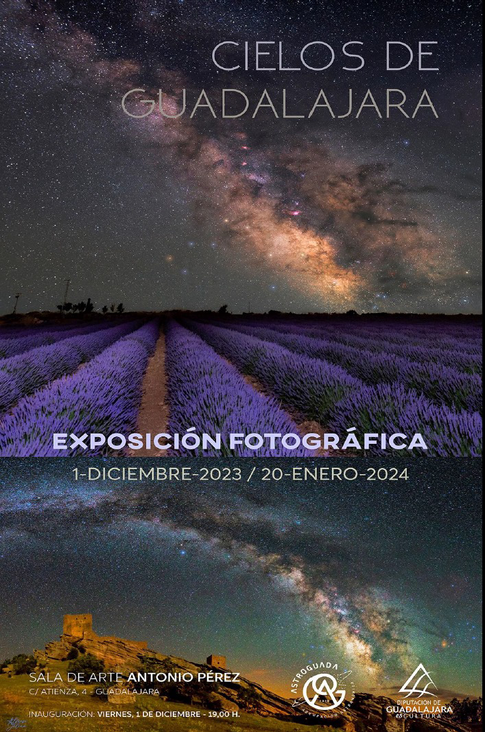 Desde el 1 de diciembre de 2023 hasta el 24 de enero de 2024 en la Sala de arte Antonio Pérez (C/Atienza, 4 Guadalajara - España) está abierta de lunes a sábados no festivos de 19 a 21 horas la exposición "Cielos de Guadalajara" en la que se muestran treinta y seis fotografías de paisaje astronómico, solares, lunares, planetarias y de cielo profundo realizadas desde localizaciones de la provincia.