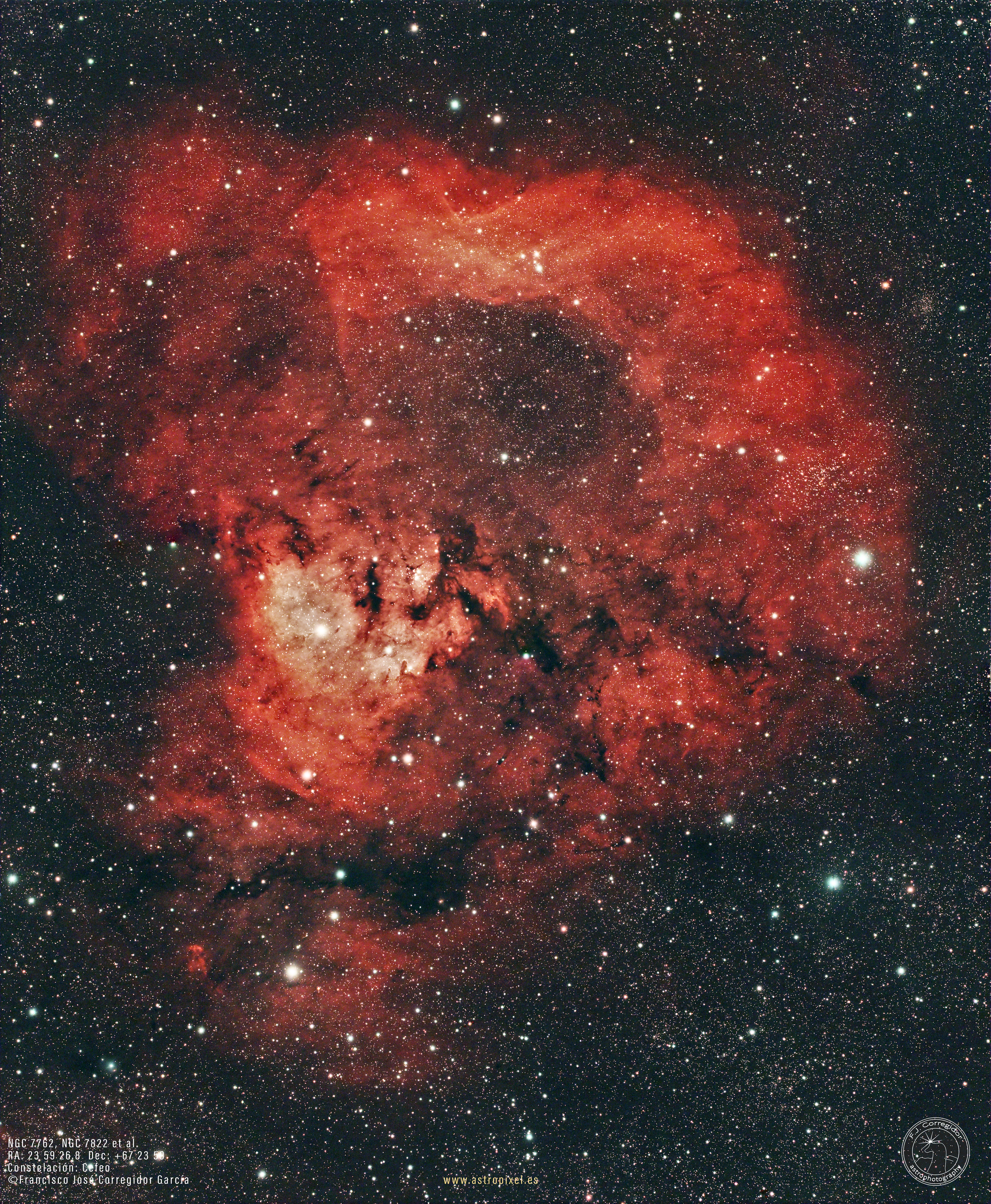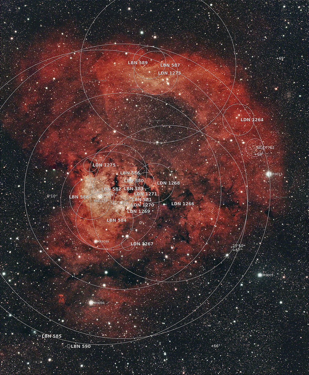 La imagen anotada la podéis ver a continuación, como se puede comprobar es un objeto complejo, con muchos otros LDN y LBN y NGC 7822 propiamente dicho se encuentra en el área central de la imagen, en una zona de fuerte formación estelar con pilares y trompas de elefante.
